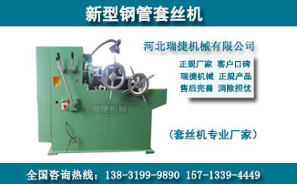 瑞捷套絲機設備采用液壓裝置成功解決勞動強度大,效率低,且無定位裝置,絲扣長短難控制等弊端,可一次型完成螺紋加工成型且螺紋牙形飽滿光滑。套絲機的主要部件及結構是由套絲機床的傳動系統(tǒng),支架系統(tǒng),切線板牙頭,定位裝置及液壓系統(tǒng)組成,工作時只要將工件裝入夾鉗,其余程序?qū)⒆詣油瓿桑僮骱唵?,通俗易懂,瑞捷套絲機廠家直銷,質(zhì)量有保證,減少不必要的中間環(huán)節(jié),為客戶帶來實實在在的優(yōu)惠政策,歡迎新老客戶洽談合作事宜和來電咨詢.