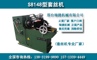 瑞捷套絲機設備采用液壓裝置成功解決勞動強度大,效率低,且無定位裝置,絲扣長短難控制等弊端,可一次型完成螺紋加工成型且螺紋牙形飽滿光滑。套絲機的主要部件及結構是由套絲機床的傳動系統(tǒng),支架系統(tǒng),切線板牙頭,定位裝置及液壓系統(tǒng)組成,工作時只要將工件裝入夾鉗,其余程序?qū)⒆詣油瓿桑僮骱唵?,通俗易懂,瑞捷套絲機廠家直銷,質(zhì)量有保證,減少不必要的中間環(huán)節(jié),為客戶帶來實實在在的優(yōu)惠政策,歡迎新老客戶洽談合作事宜和來電咨詢.